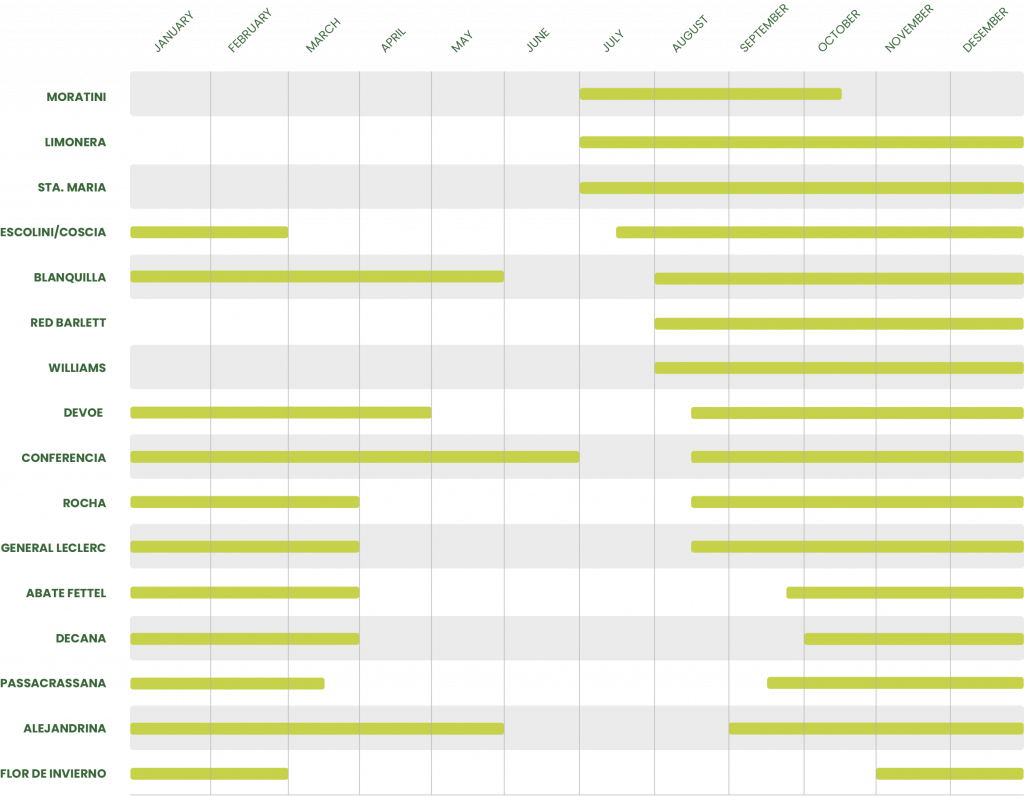 Medium to thick, pear shape, sometimes truncated in the peduncle area. Regular and symmetrical. Smooth skin, yellow with a pink shade in the area exposed to the sun. White and juicy pulp. A little granulated, with a medium tasty quality.